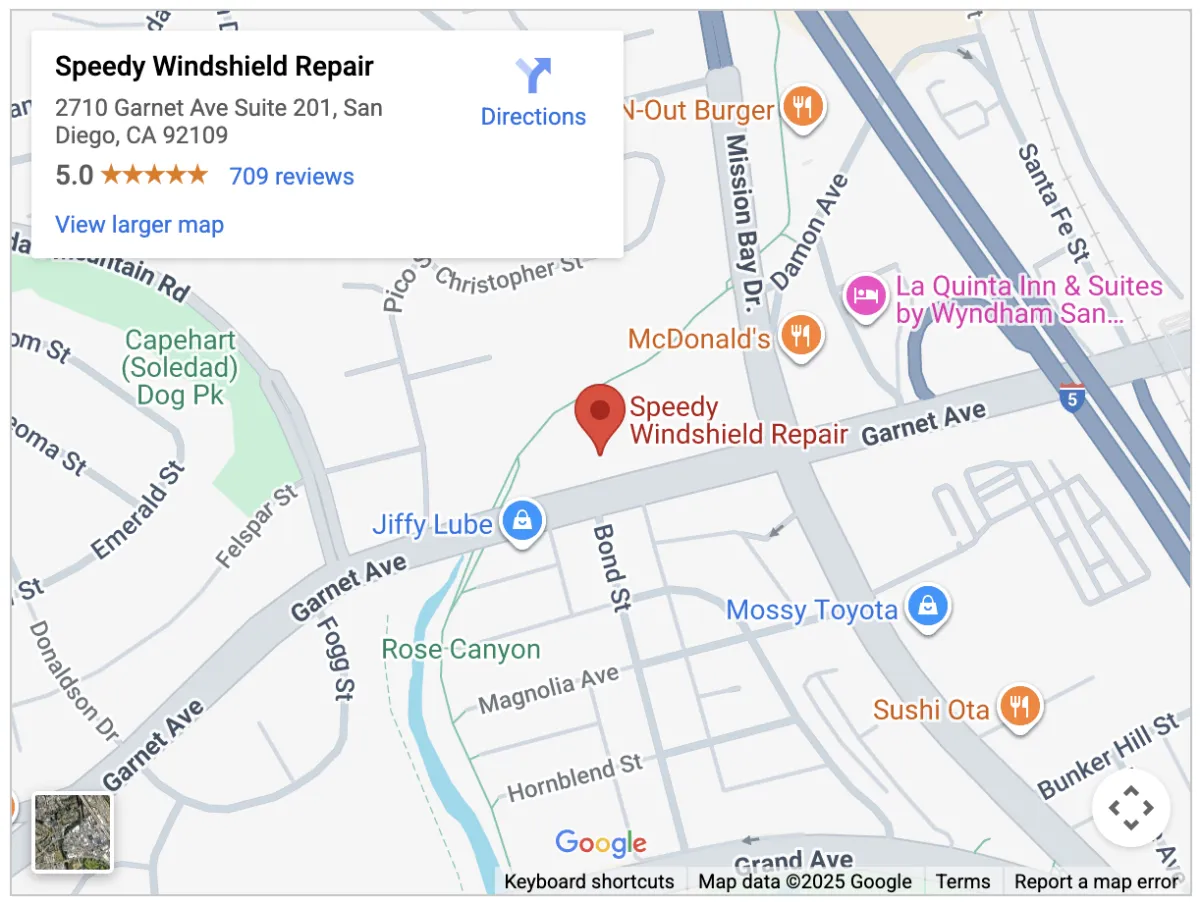 Speedy Windshield Repair proudly serves San Diego, CA, and surrounding areas, providing fast, reliable mobile and in-shop windshield replacement. We offer same-day and next-day service in San Diego, Chula Vista, El Cajon, La Mesa, National City, Santee, Spring Valley, Coronado, Poway, and other nearby areas. If you’re unsure whether we cover your location, just give us a call—we’re happy to help!